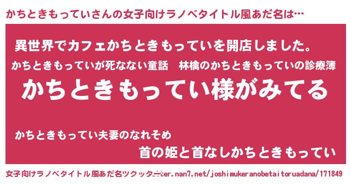 かちときもっていさんの女子向けラノベタイトル風あだ名は… 『かちときもってい様がみてる』『異世界でカフェかちときもっていを開店しました。』『首の姫と首なしかちときもってい』 ツクッター #女子向けラノベタイトル風あだ名ツクッター http://tkutter.nan7.net/joshimukeranobetaitoruadana/171849/