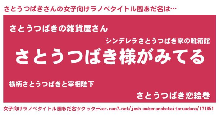 | 男性向けラノベタイトル風あだ名 | 『さとうつばきの嫁は女の子じゃないと思った?』 |