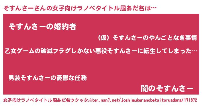 | 男性向けラノベタイトル風あだ名 | 『魔弾の王とそすんさー』 |