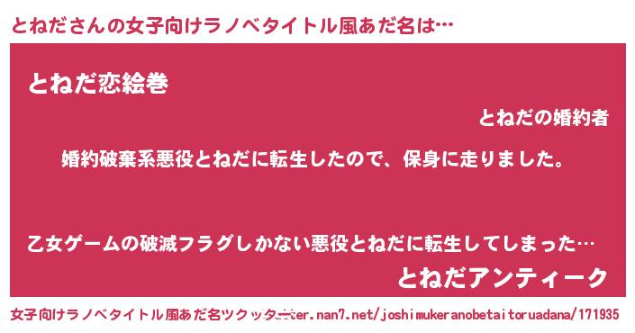 | 男性向けラノベタイトル風あだ名 | 『転生したらとねだだった件』 |