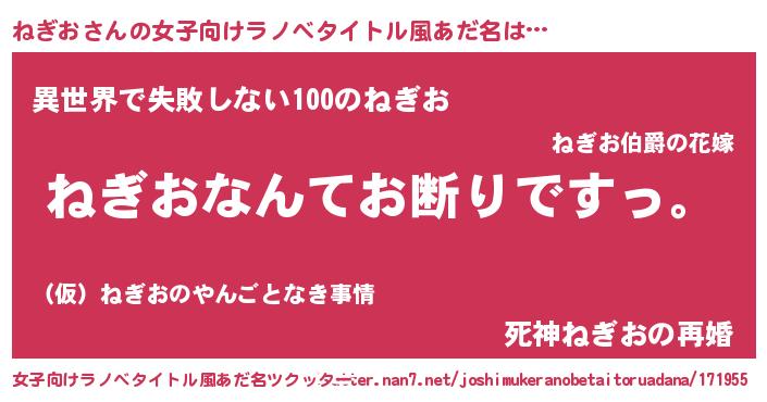 | 男性向けラノベタイトル風あだ名 | 『魔法科高校のねぎお』『ねぎおの憂鬱』 |