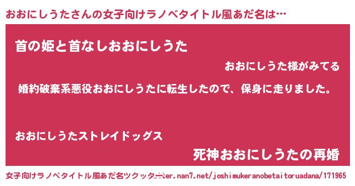 おおにしうたさんの女子向けラノベタイトル風あだ名は… 『婚約破棄系悪役おおにしうたに転生したので、保身に走りました。』『首の姫と首なしおおにしうた』『死神おおにしうたの再婚』 ツクッター #女子向けラノベタイトル風あだ名ツクッター http://tkutter.nan7.net/joshimukeranobetaitoruadana/171965/