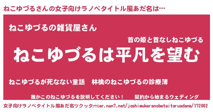 | 男性向けラノベタイトル風あだ名 | 『ダンジョンにねこゆづるを求めるのは間違っているだろうか』 |