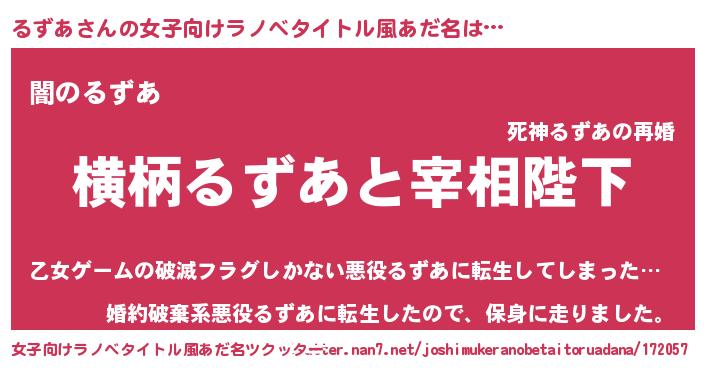 | 男性向けラノベタイトル風あだ名 | 『るずあに滅ぼされるだけの簡単なお仕事です』 |