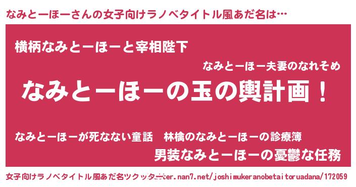 | 男性向けラノベタイトル風あだ名 | 『なみとーほー~年齢イコール彼女いない歴の魔法使い~』 |
