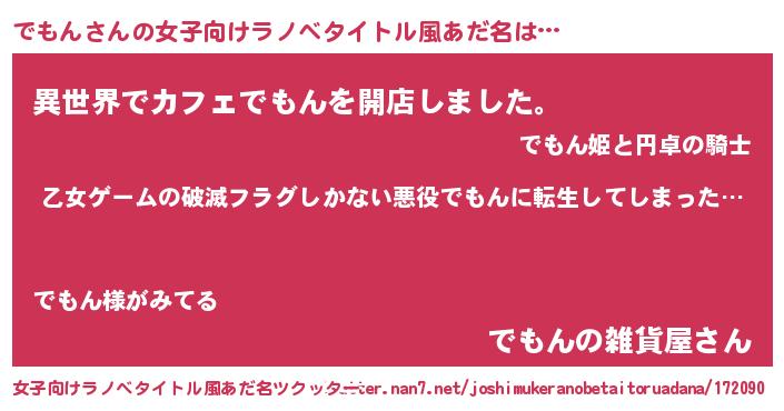 | 男性向けラノベタイトル風あだ名 | 『この素晴らしい世界にでもんを!』 |