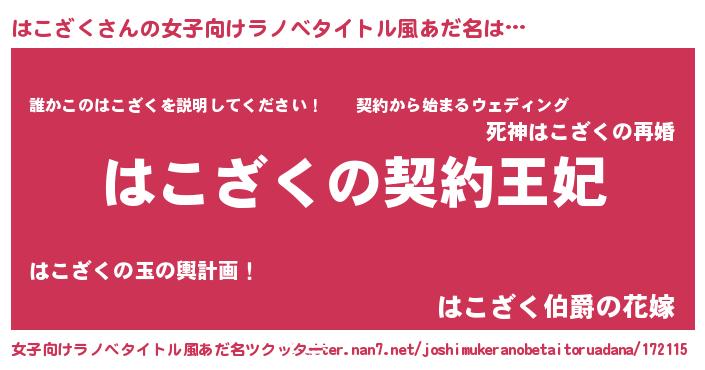 | 男性向けラノベタイトル風あだ名 | 『誰もが恐れるあのはこざくが、ぼくの専属メイドになるようです。』 |