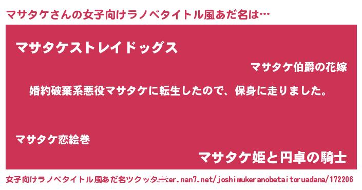 | 男性向けラノベタイトル風あだ名 | 『マサタケスレイヤー』 |