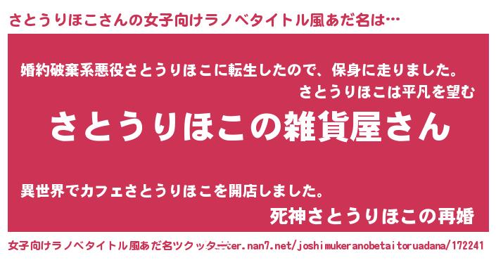 | 男性向けラノベタイトル風あだ名 | 『やはりさとうりほこの青春ラブコメはまちがっている 』 |