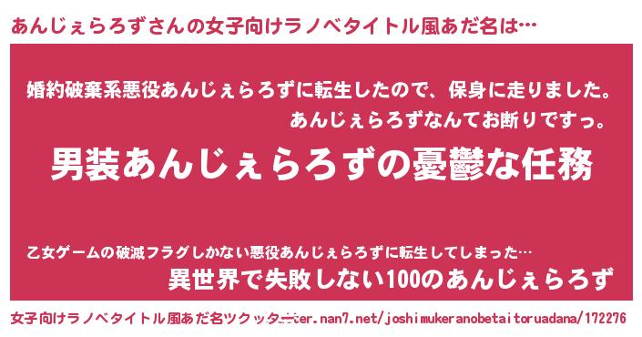| 男性向けラノベタイトル風あだ名 | 『うちのあんじぇらろずが世界を掌握している!』 |