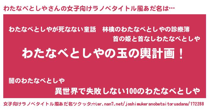 | 男性向けラノベタイトル風あだ名 | 『転生したらわたなべとしやだった件』 |