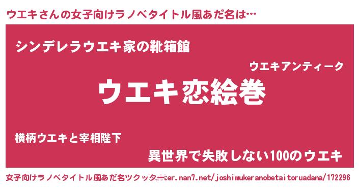 | 男性向けラノベタイトル風あだ名 | 『おまえをオタクにしてやるから、俺をウエキにしてくれ! 』 |
