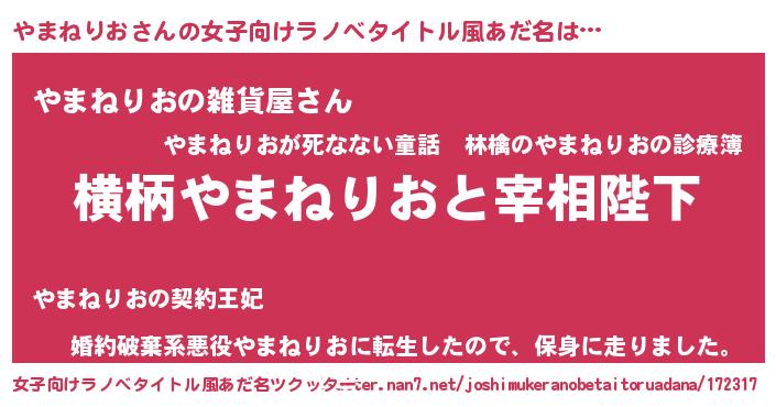 | 男性向けラノベタイトル風あだ名 | 『やまねりおに滅ぼされるだけの簡単なお仕事です』 |