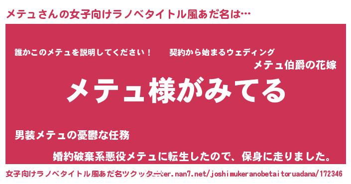 | 男性向けラノベタイトル風あだ名 | 『メテュの嫁は女の子じゃないと思った?』 |