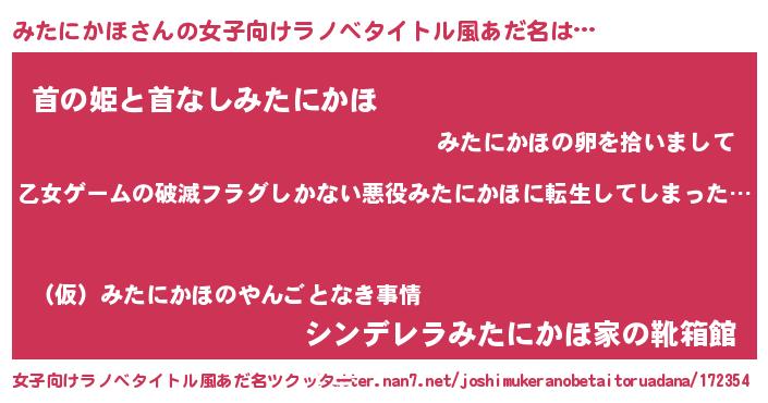 | 男性向けラノベタイトル風あだ名 | 『この素晴らしい世界にみたにかほを!』 |