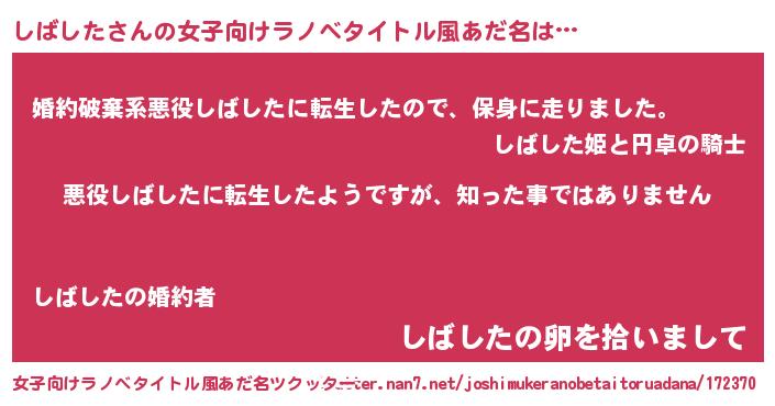 | 男性向けラノベタイトル風あだ名 | 『この素晴らしい世界にしばしたを!』 |