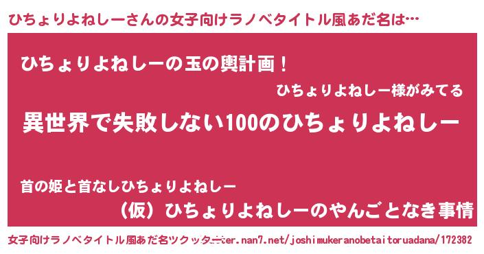| 男性向けラノベタイトル風あだ名 | 『ひちょりよねしーという概念が存在しない退屈な世界 』 |
