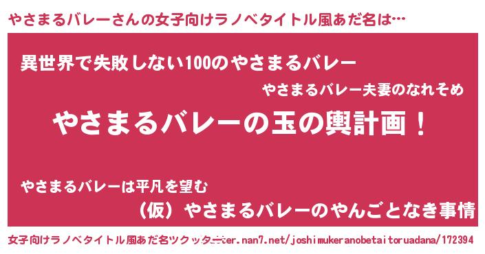 | 男性向けラノベタイトル風あだ名 | 『やさまるバレー~年齢イコール彼女いない歴の魔法使い~』 |