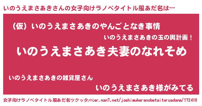 | 男性向けラノベタイトル風あだ名 | 『おまえをオタクにしてやるから、俺をいのうえまさあきにしてくれ! 』 |