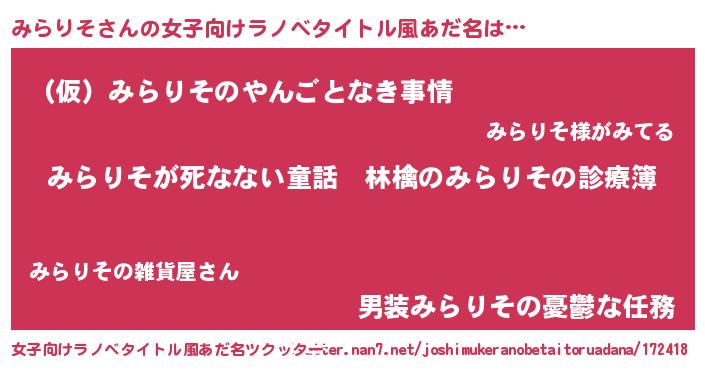 | 男性向けラノベタイトル風あだ名 | 『魔弾の王とみらりそ』『みらりその憂鬱』 |