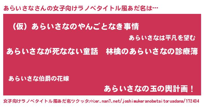| ヒーロー風カッコイイあだ名 | 『仮面アラダー』『スーパーアライサナ』 |