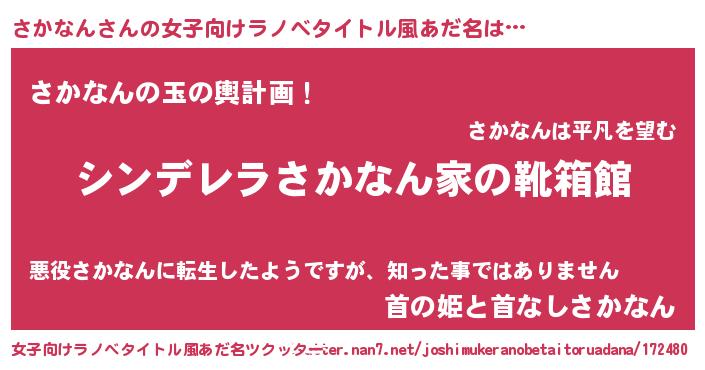 さかなんさんの女子向けラノベタイトル風あだ名は… 『シンデレラさかなん家の靴箱館』『さかなんの玉の輿計画!』『首の姫と首なしさかなん』 ツクッター #女子向けラノベタイトル風あだ名ツクッター http://tkutter.nan7.net/joshimukeranobetaitoruadana/172480/
