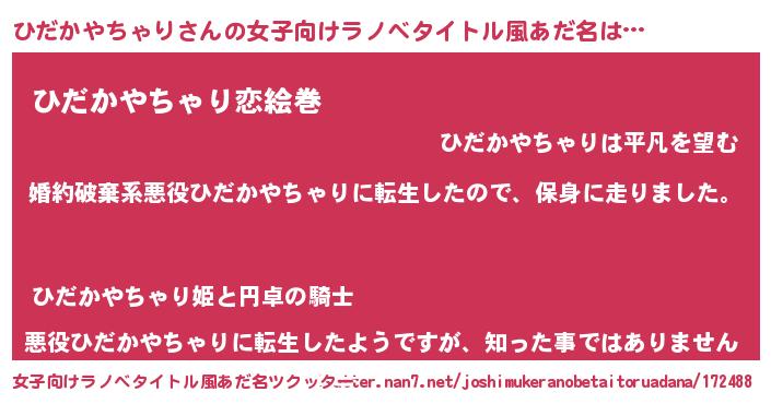 | 男性向けラノベタイトル風あだ名 | 『ヒダカヤチャリスレイヤー』 |