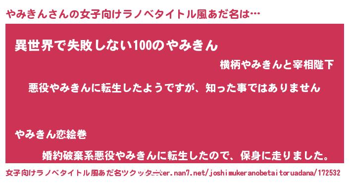 | 男性向けラノベタイトル風あだ名 | 『この素晴らしい世界にやみきんを!』 |