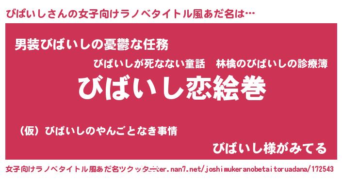 | 男性向けラノベタイトル風あだ名 | 『おまえをオタクにしてやるから、俺をびばいしにしてくれ! 』 |