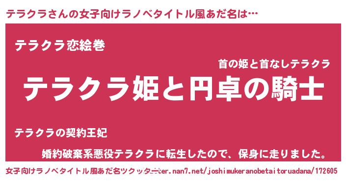 | 男性向けラノベタイトル風あだ名 | 『テラクラアートオンライン』 |