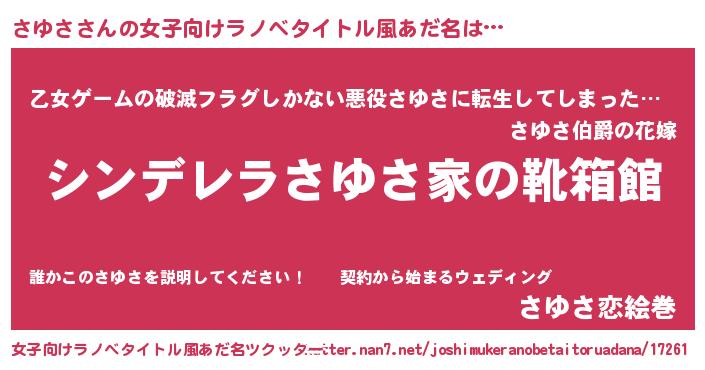 | 胡散臭い通販商品みたいなあだ名 | 『世界中を虜にした100年もののヴィンテージワイン…その名も「さゆさ」』 |