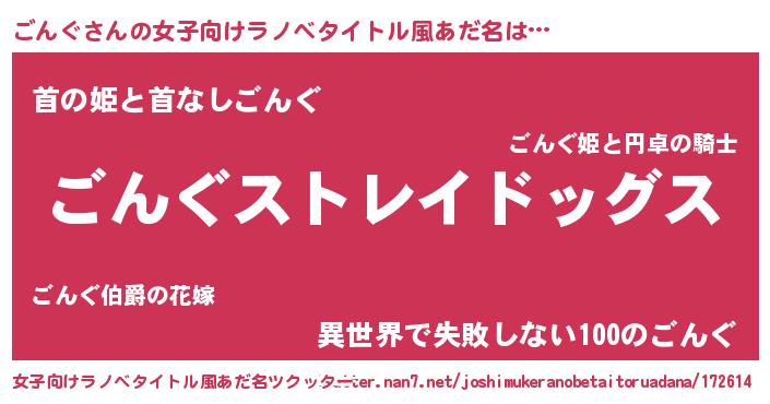 | 男性向けラノベタイトル風あだ名 | 『Re:ごんぐから始める異世界生活』 |