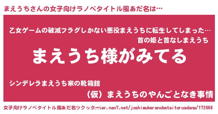 | 男性向けラノベタイトル風あだ名 | 『まえうちの嫁は女の子じゃないと思った?』 |