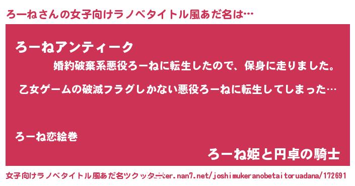 | 男性向けラノベタイトル風あだ名 | 『魔弾の王とろーね』『ろーねの憂鬱』 |