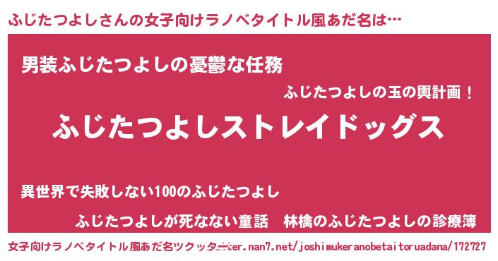 | 男性向けラノベタイトル風あだ名 | 『Re:ふじたつよしから始める異世界生活』 |