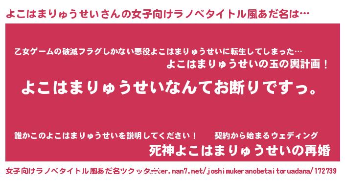 よこはまりゅうせいさんの女子向けラノベタイトル風あだ名は… 『よこはまりゅうせいなんてお断りですっ。』『乙女ゲームの破滅フラグしかない悪役よこはまりゅうせいに転生してしまった…』『死神よこはまりゅうせいの再婚』 ツクッター #女子向けラノベタイトル風あだ名ツクッター http://tkutter.nan7.net/joshimukeranobetaitoruadana/172739/
