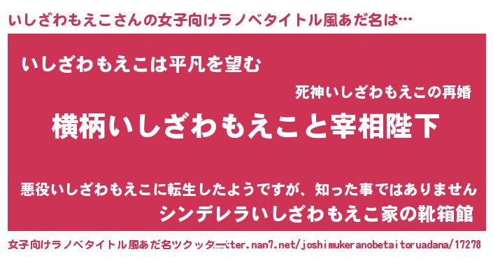 | 男性向けラノベタイトル風あだ名 | 『いしざわもえこに滅ぼされるだけの簡単なお仕事です』 |