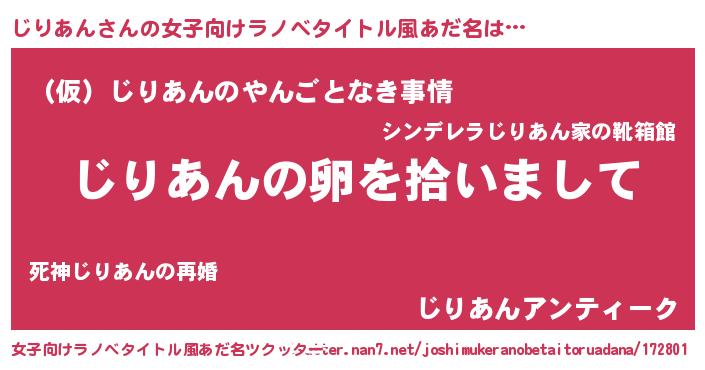 | 男性向けラノベタイトル風あだ名 | 『ダンジョンにじりあんを求めるのは間違っているだろうか』 |