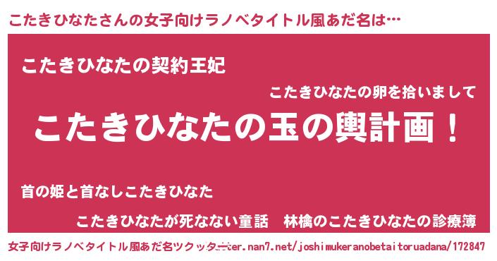 | 男性向けラノベタイトル風あだ名 | 『こたきひなた~年齢イコール彼女いない歴の魔法使い~』 |