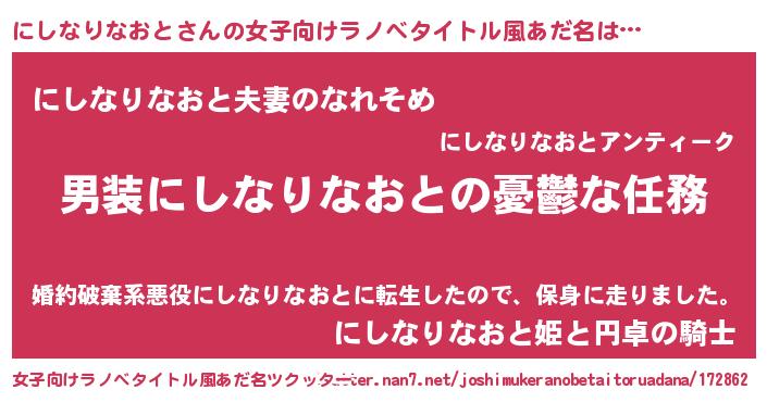 | 男性向けラノベタイトル風あだ名 | 『うちのにしなりなおとが世界を掌握している!』 |