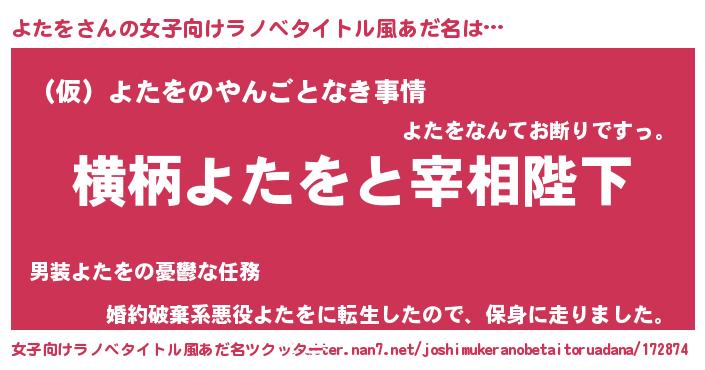 | 男性向けラノベタイトル風あだ名 | 『よたをに滅ぼされるだけの簡単なお仕事です』 |