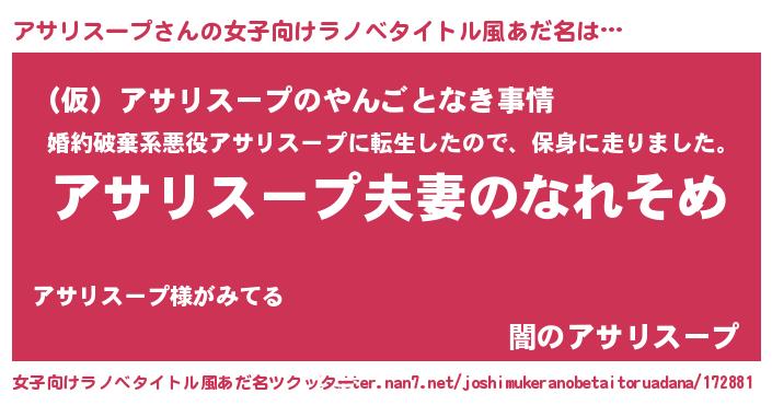 | 男性向けラノベタイトル風あだ名 | 『おまえをオタクにしてやるから、俺をアサリスープにしてくれ! 』 |
