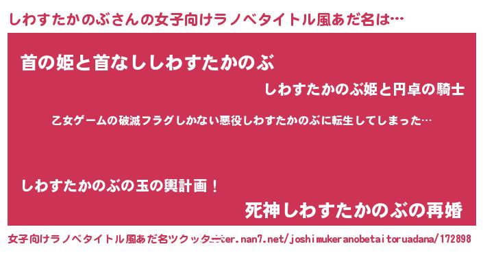 | 男性向けラノベタイトル風あだ名 | 『この素晴らしい世界にしわすたかのぶを!』 |