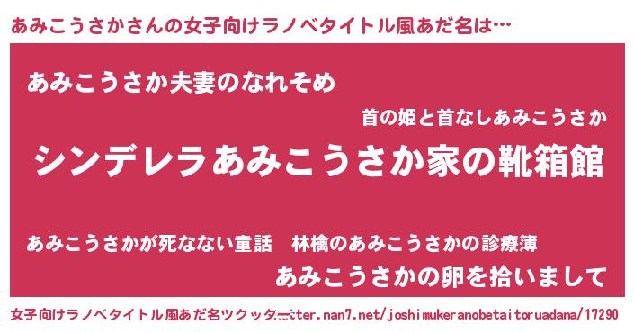 | 男性向けラノベタイトル風あだ名 | 『冴えないあみこうさかの育てかた』 |