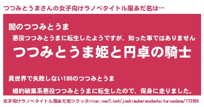 | 男性向けラノベタイトル風あだ名 | 『ツツミトウマアートオンライン』 |
