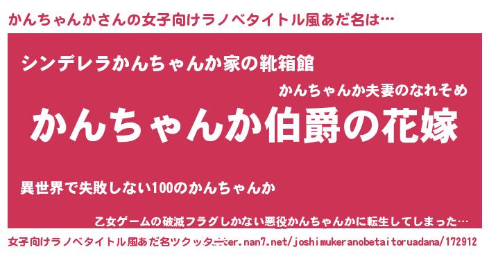 | 男性向けラノベタイトル風あだ名 | 『うちの娘の為ならば、俺はもしかしたらかんちゃんかも倒せるかもしれない。』 |
