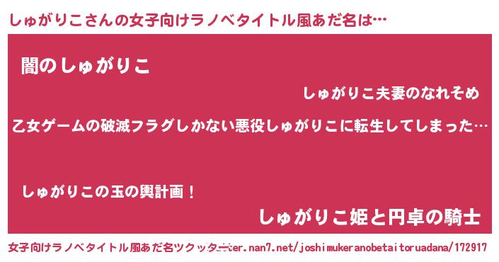 | 男性向けラノベタイトル風あだ名 | 『魔弾の王としゅがりこ』 |