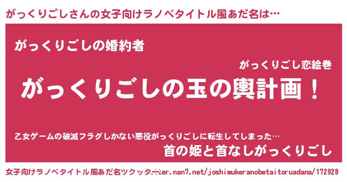 | 男性向けラノベタイトル風あだ名 | 『がっくりごし~年齢イコール彼女いない歴の魔法使い~』 |