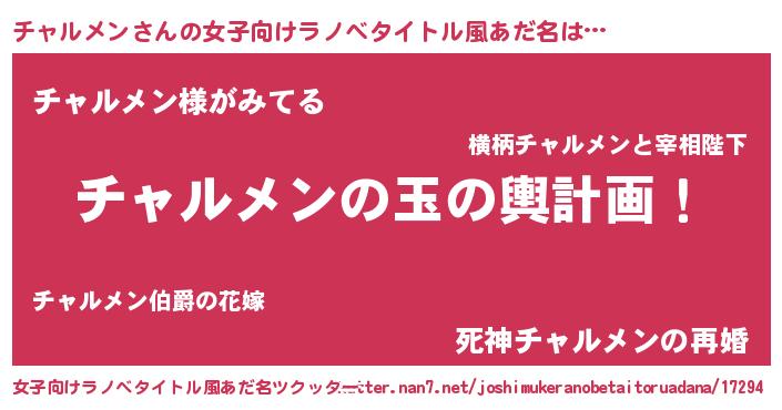 | 男性向けラノベタイトル風あだ名 | 『チャルメン~年齢イコール彼女いない歴の魔法使い~』 |