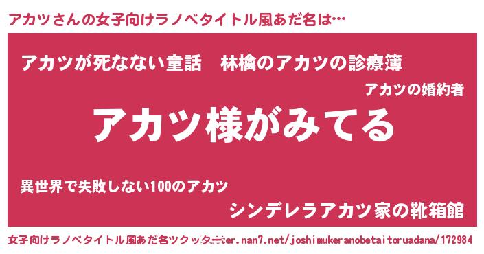 | 男性向けラノベタイトル風あだ名 | 『アカツの嫁は女の子じゃないと思った?』 |